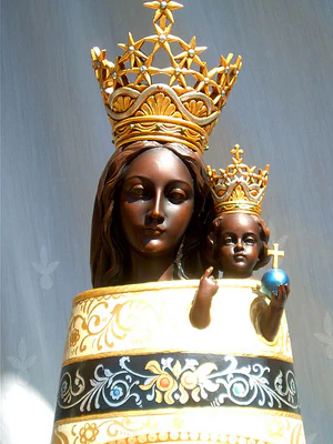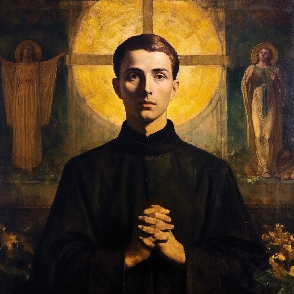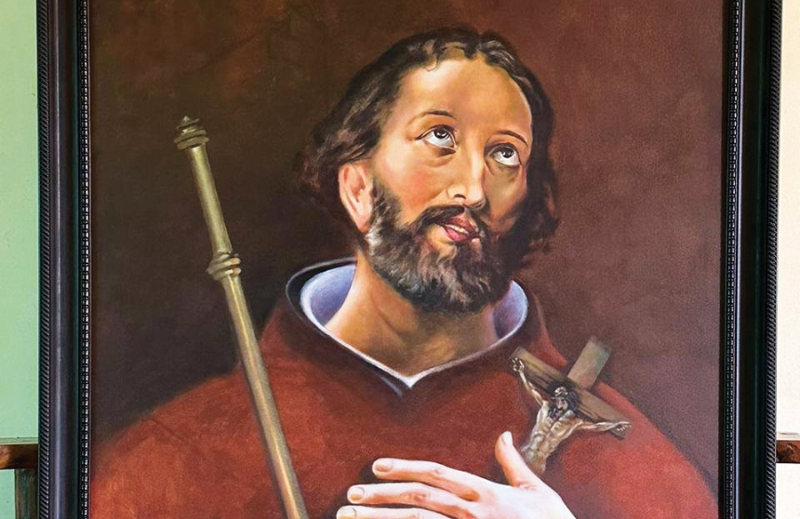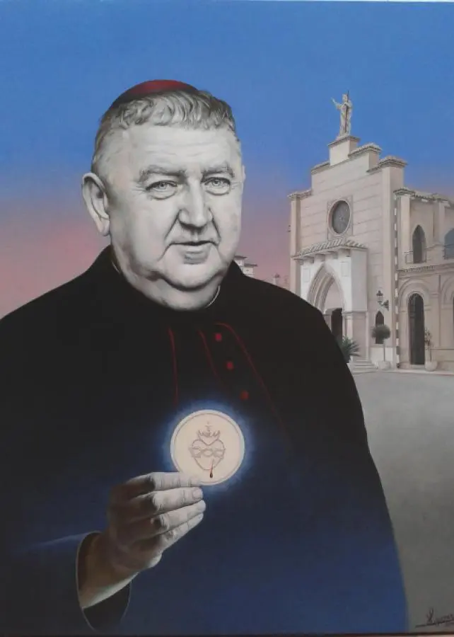 ഒരു വിശുദ്ധന്റെ രൂപം വളരെ പ്രസിദ്ധമാണ്; ഹൃദയത്തിൽ ദിവ്യകാരുണ്യത്തിന്റെ രൂപവും, അതിൽനിന്ന് പ്രകാശവും
