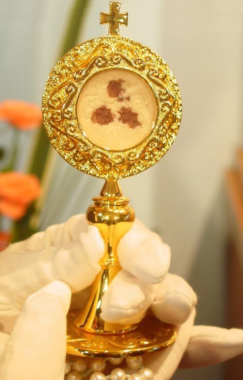 ഒരു വിശുദ്ധന്റെ രൂപം വളരെ പ്രസിദ്ധമാണ്; ഹൃദയത്തിൽ ദിവ്യകാരുണ്യത്തിന്റെ രൂപവും,