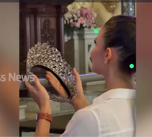മിസ് യൂണിവേഴ്സ് മഹില റോത്ത് കൈയിൽ കിരീടവുമായി പരിശുദ്ധനായ ദിവ്യകാരുണ്യ