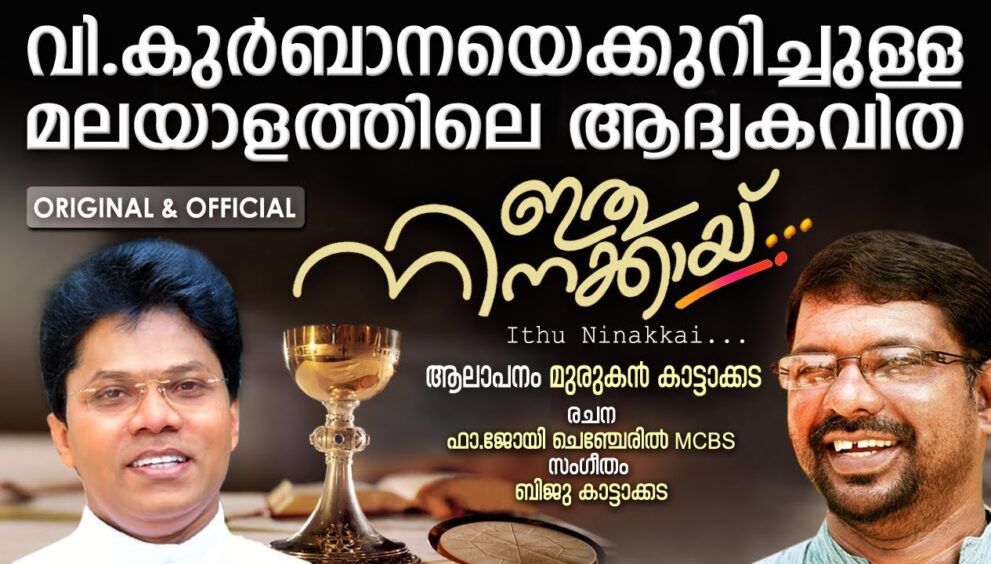 ദിവ്യകാരുണ്യ ആരാധനയുടെ മുമ്പിൽ ചിലവഴിക്കാൻ പ്രേരിപ്പിക്കുന്ന, മനോഹരമായ കവിതയാണ്, ചങ്കിലെ ചോരയാൽ പ്രാണനിലെഴുതിയാ നേരിന്റെ പേരാണ് സ്നേഹം; രചന: ഫാ. ജോയ് ചെഞ്ചേരിയിൽ, സംഗീതം: ബിജു കാട്ടാക്കട, പാടിയത് : മുരുകൻ കാട്ടാക്കട